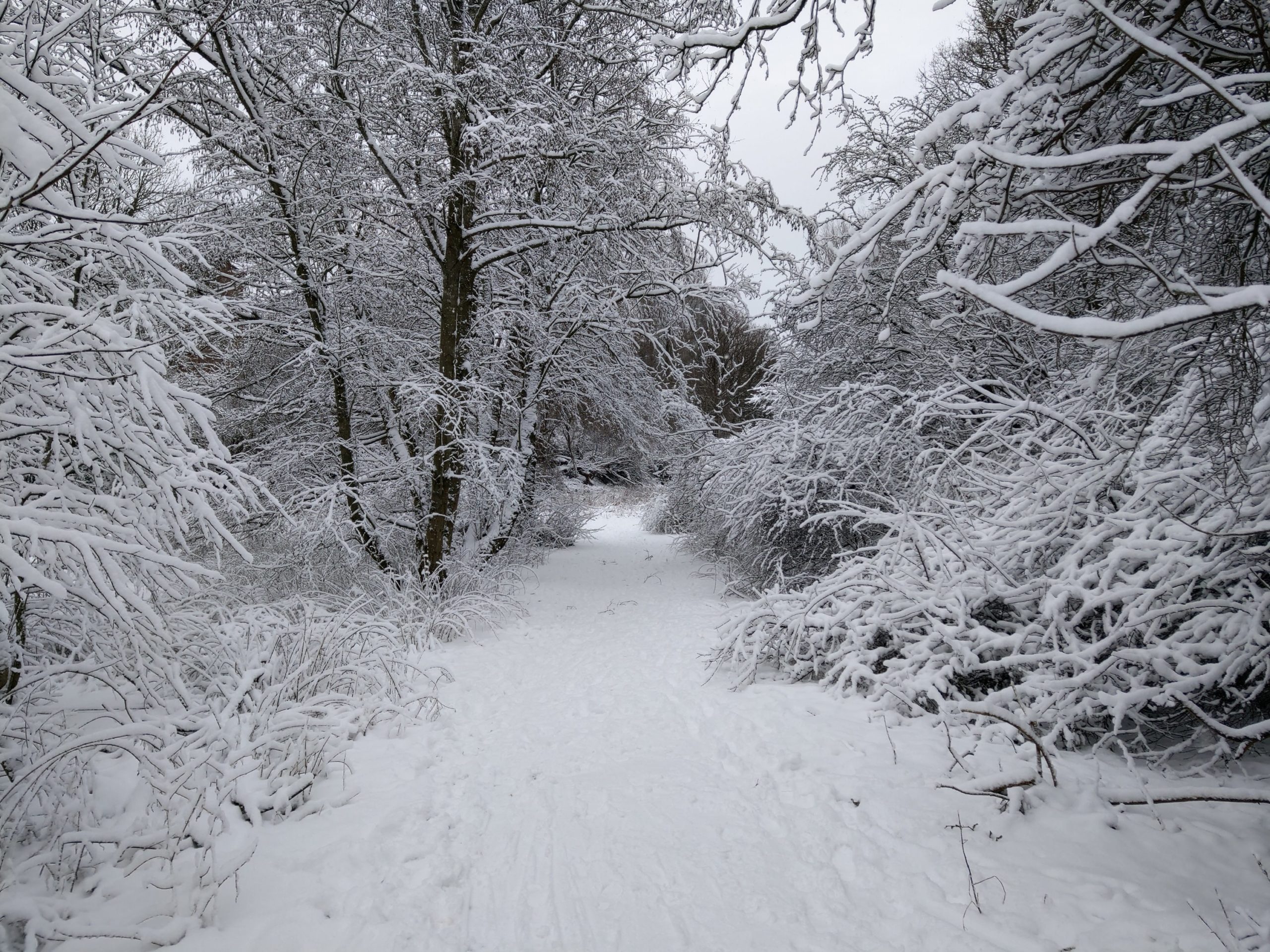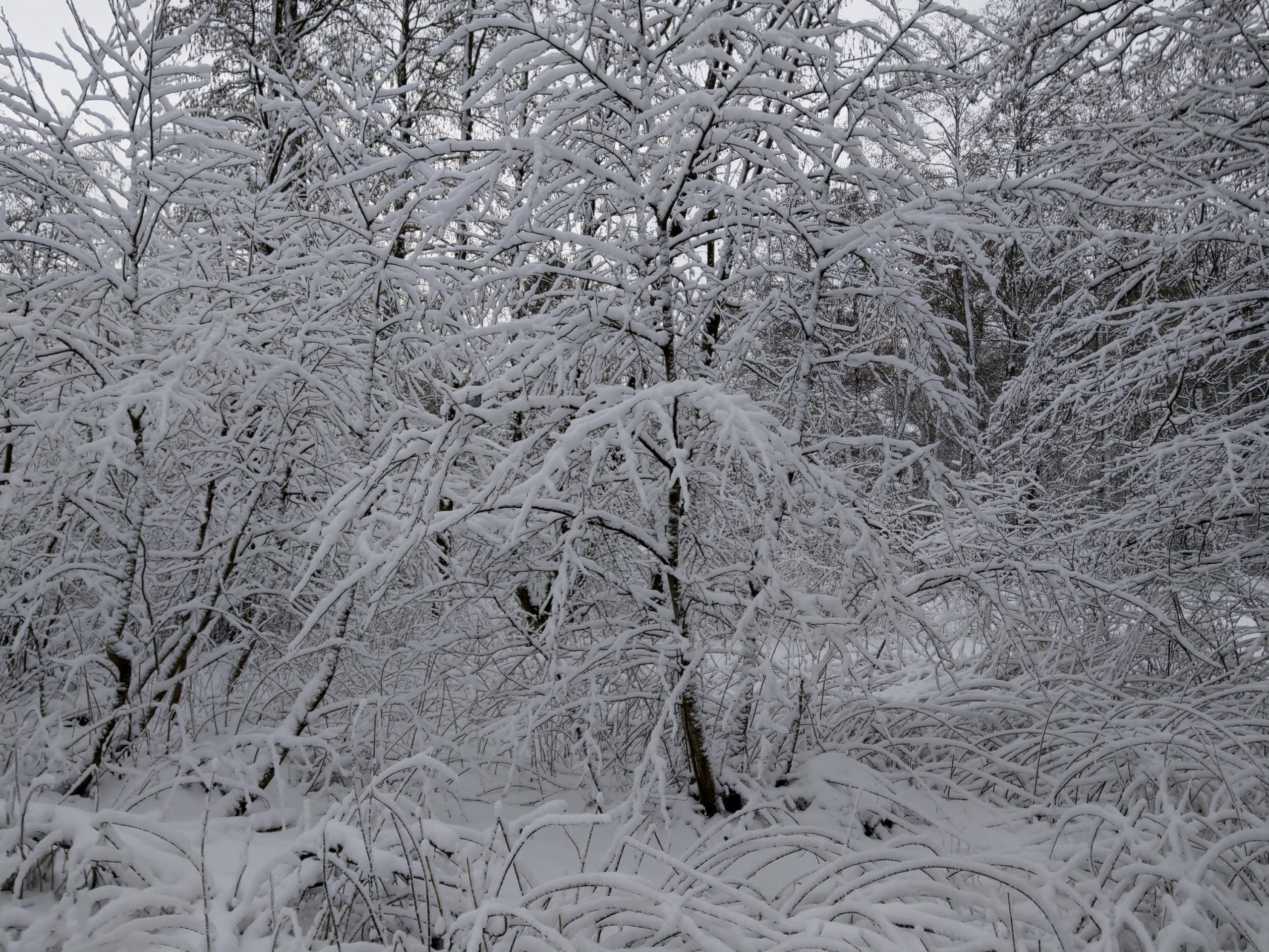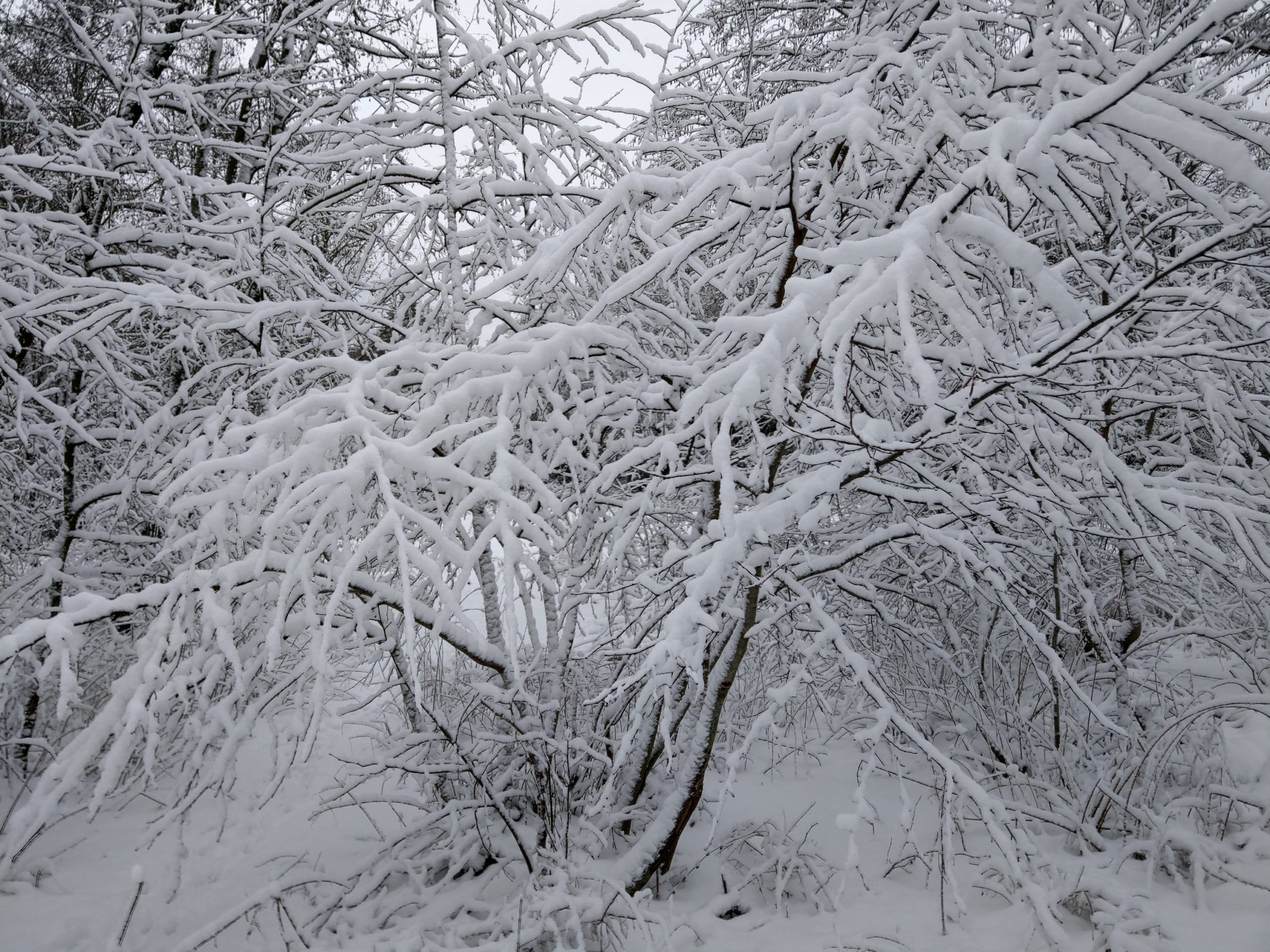 Die Zweige der Büsche und Sträucher sind bis in die kleinste Spitzen mit frischem Schnee bedeckt. Sie tragen diese seltene Last wie selbstverständlich.