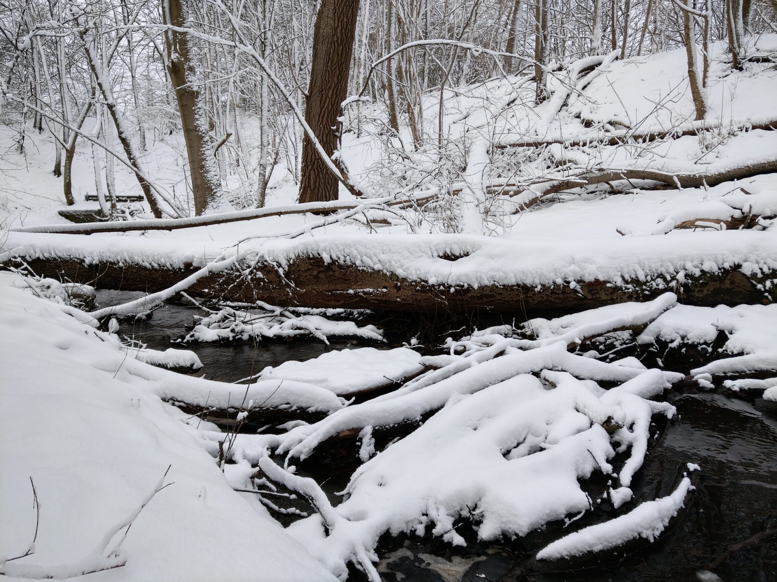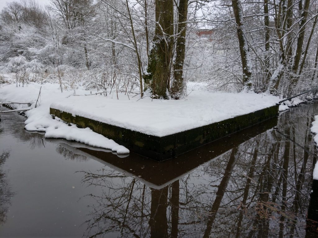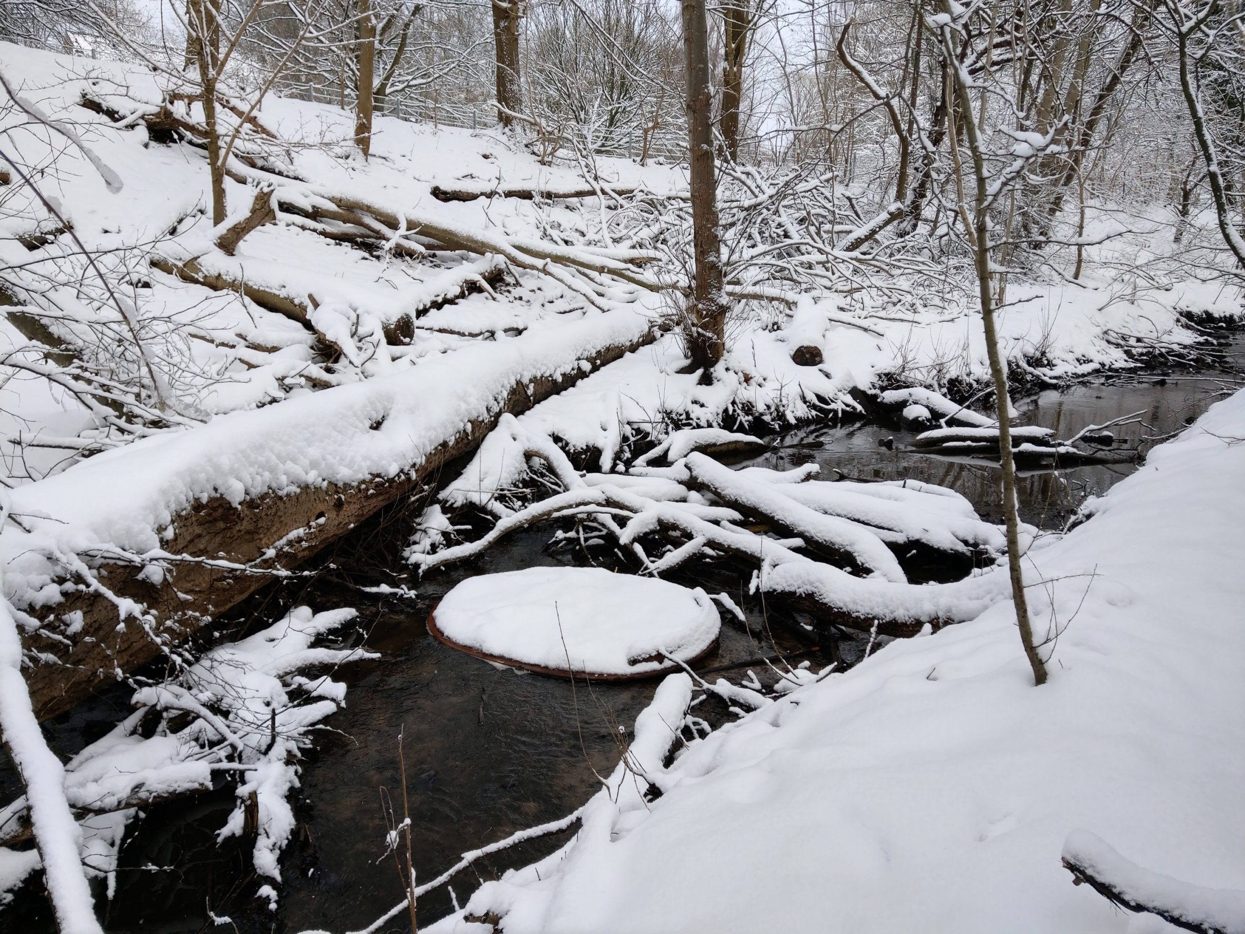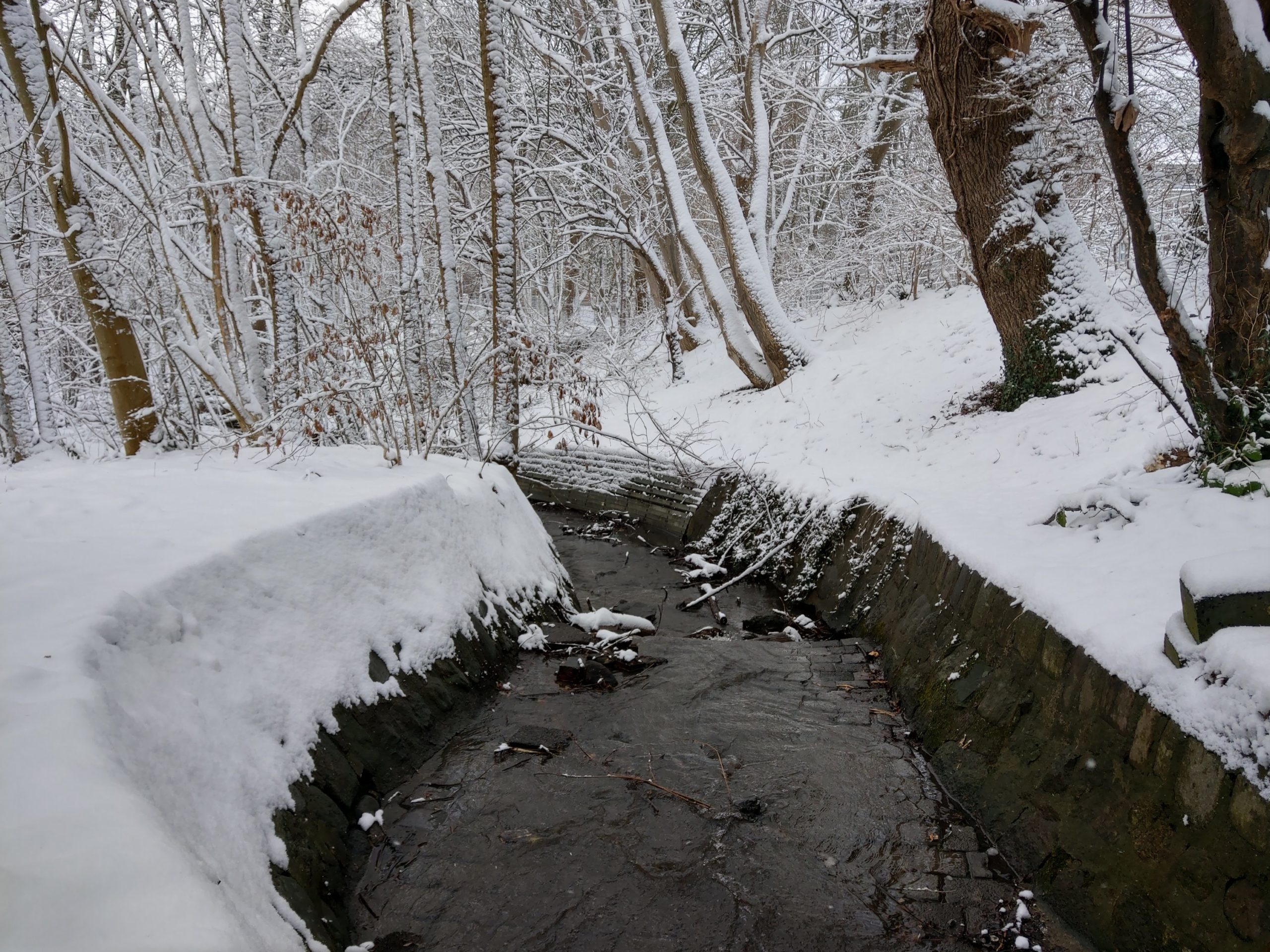 Die Osbek ist mit ihrem fließenden Wasser ein schwarzer Kontrast in den weißen Schneemassen. Unaufhaltsam und unbeirrt setzt sie ihren Lauf fort.