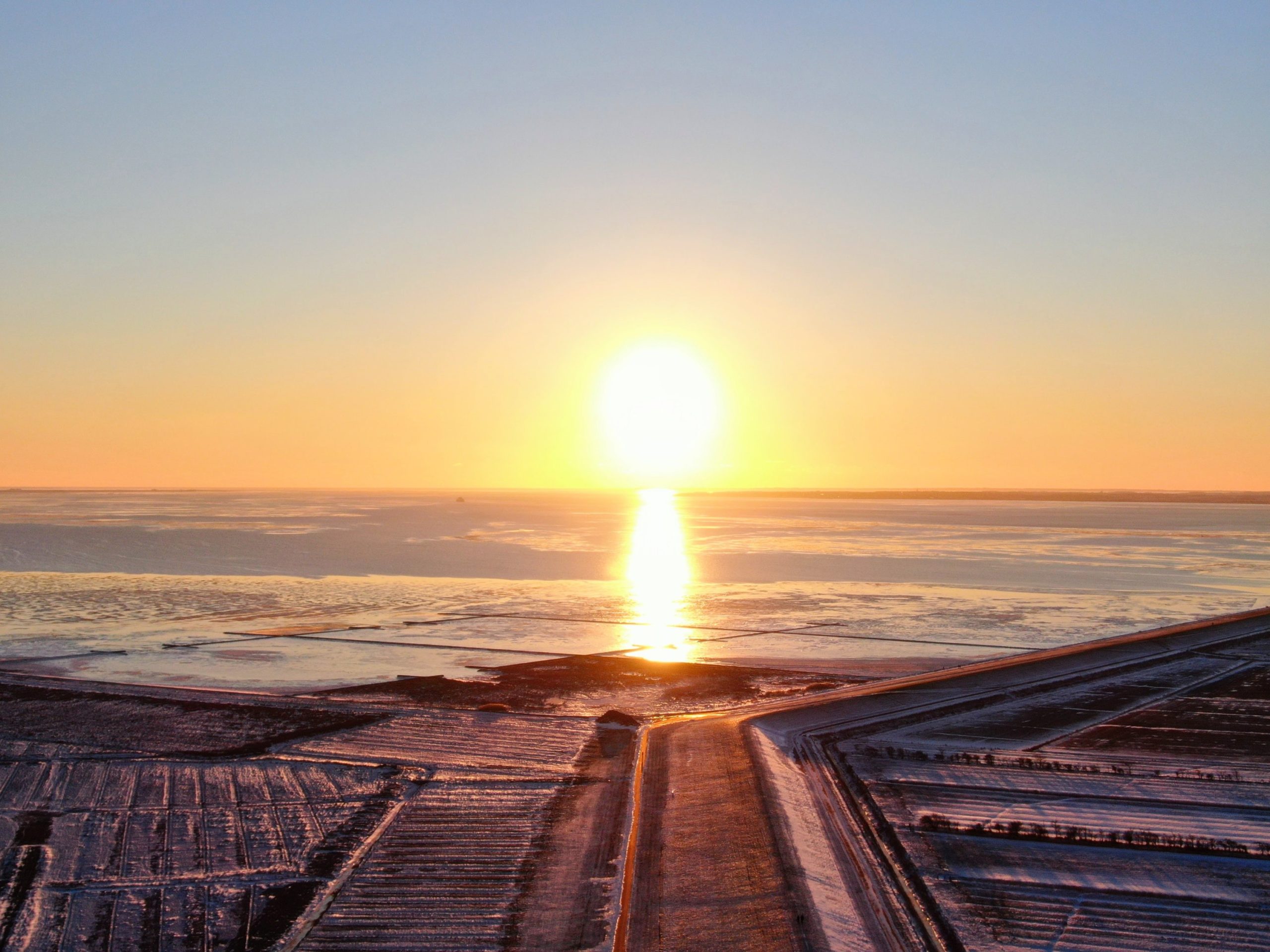 Den heutigen Sundowner erlebe ich hinterm Deich. Einen Kilometer vom Wasser entfernt stehe ich auf einer kleinen Straße mitten im ländlichen Nichts.