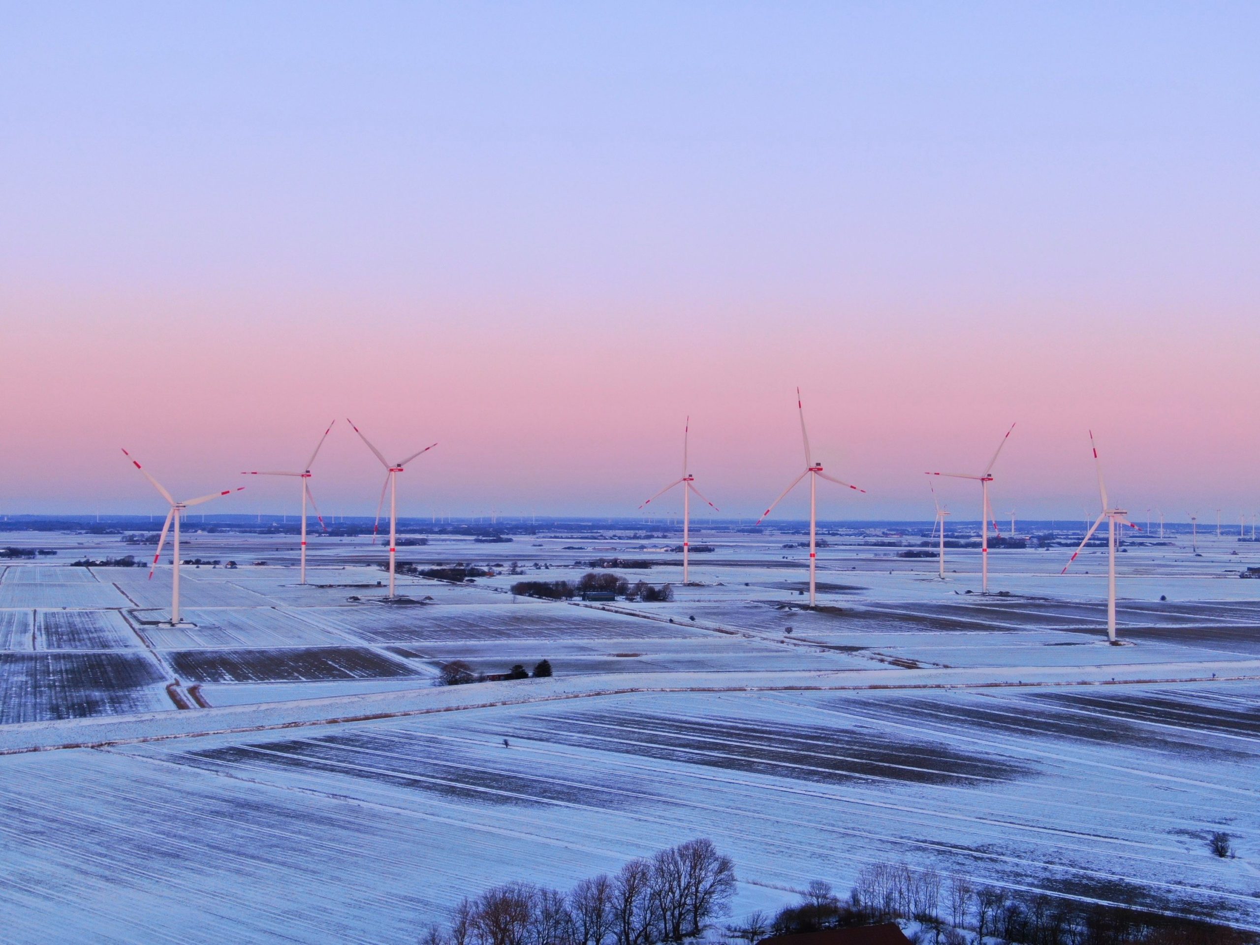 Auch gegenüber, 180 Grad entgegengesetzt, färbt sich der Himmel in pinklila und lässt die ansässigen Windräder vor dieser Kulisse kläglich erblassen.