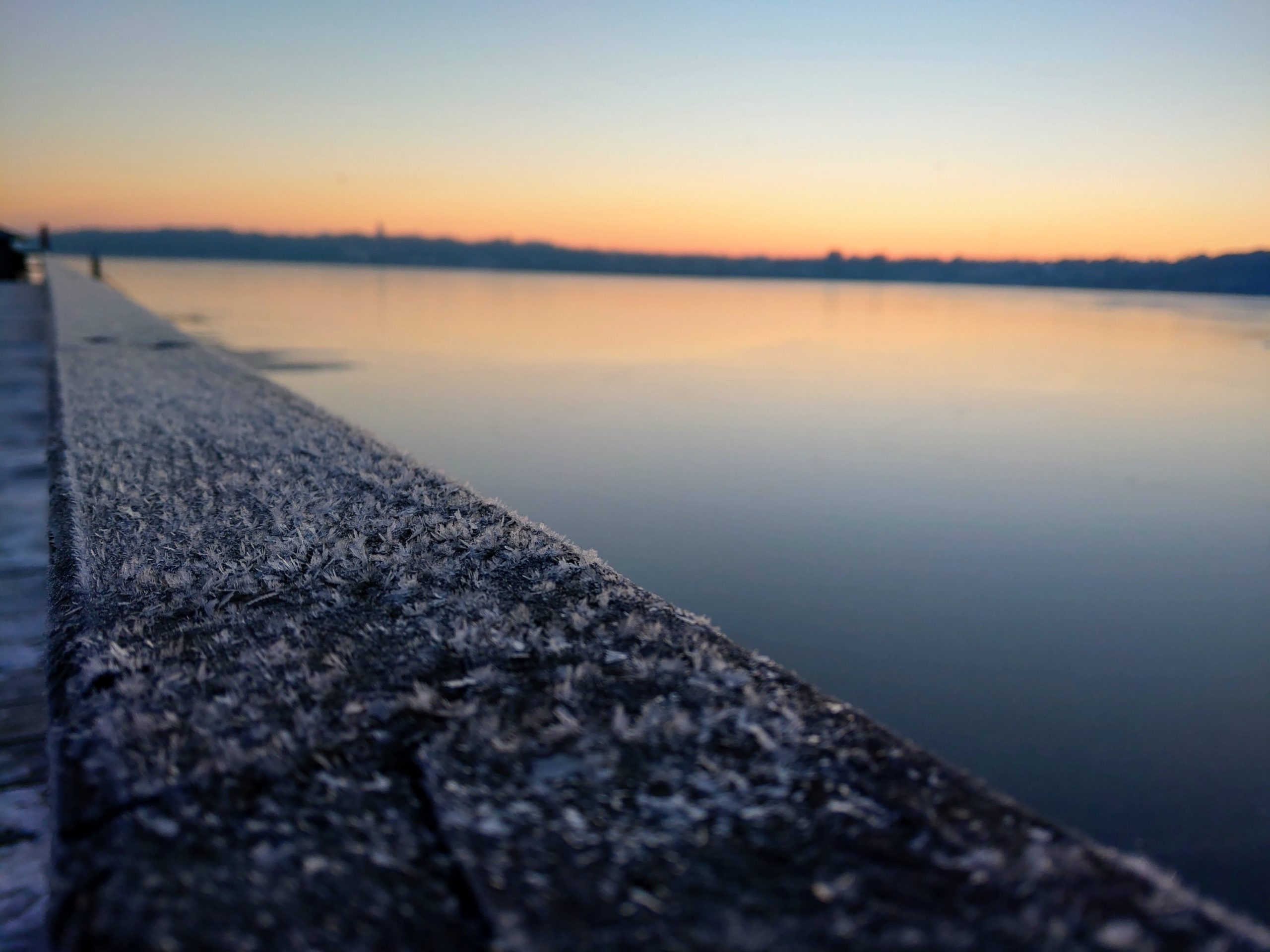 Gefrorener Schnee, gemischt mit Eis und Sand säumt das hiesige Ufer. Bei jedem Schritt knirscht und knackt es unter meinen Schuhen. Das tagsüber herangespülte Wasser gefriert in der Nacht und hinterlässt zarte Schichten aus luftigen Eiskristallen.