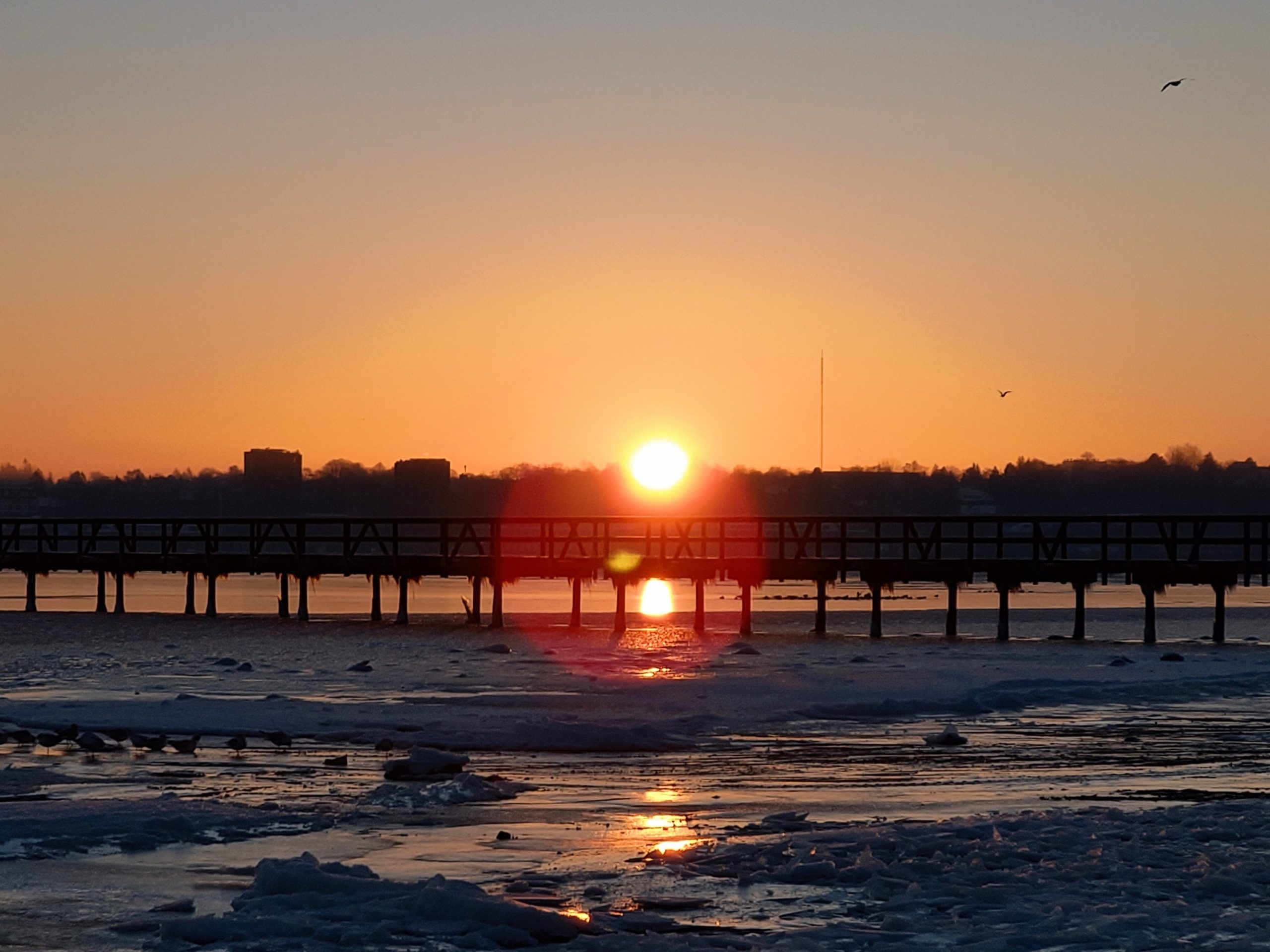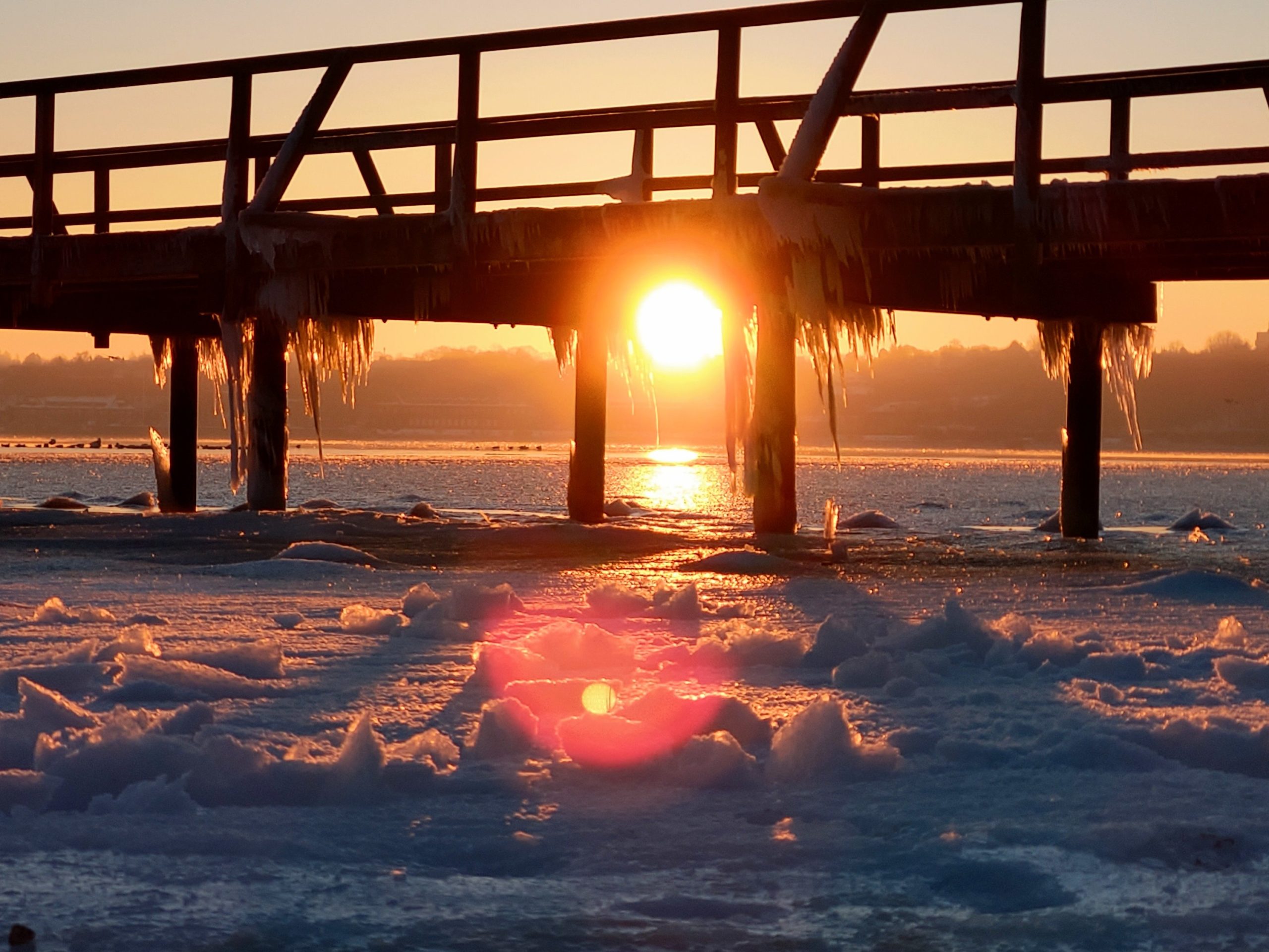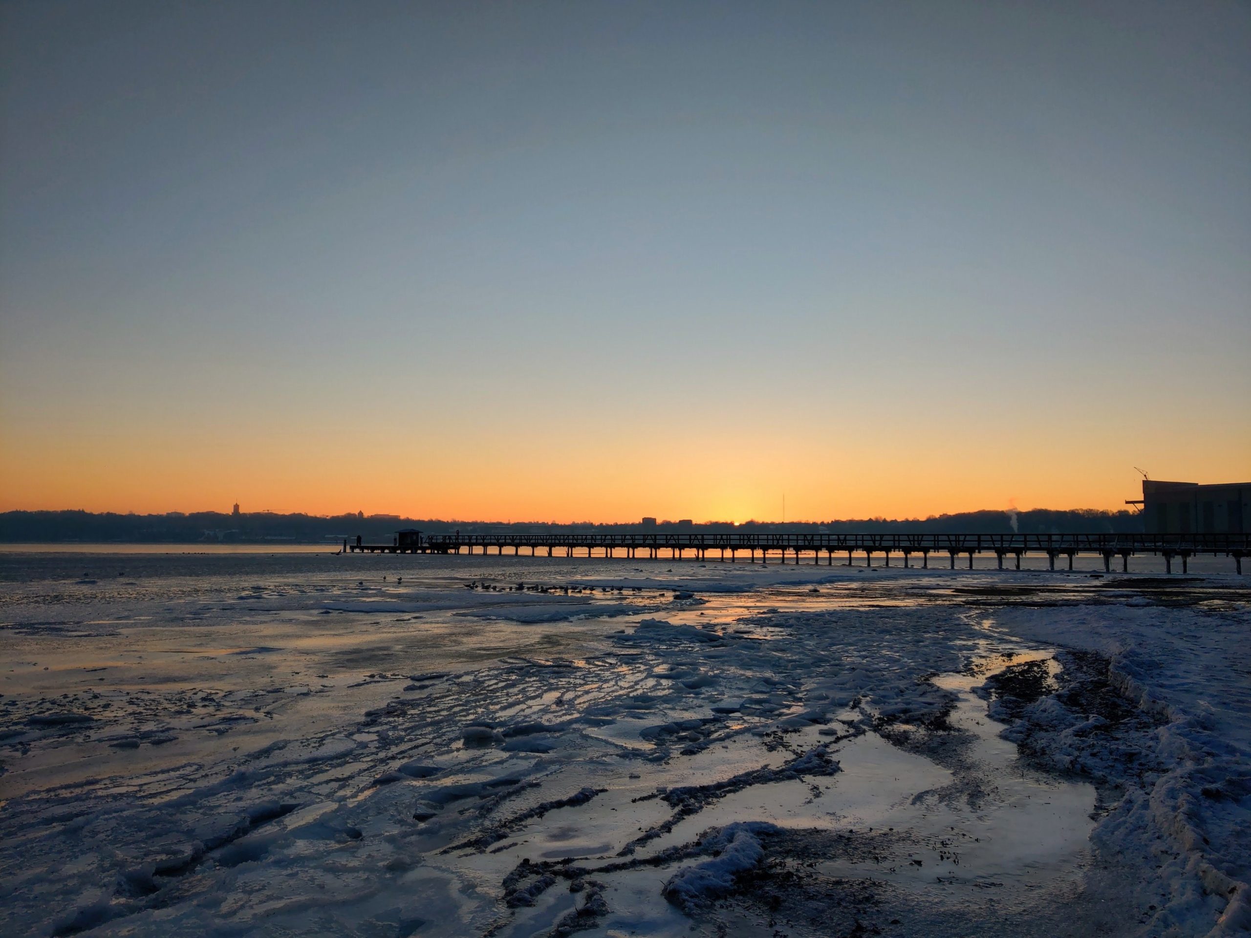 Der Tag scheint bereits erwacht, doch noch zeigt sich das Orange der Sonne nur als breiter Streifen über der gegenüberliegenden Küste. Das Licht des Himmels reflektiert auf der spiegelglatten Eisschicht der Innenförde.