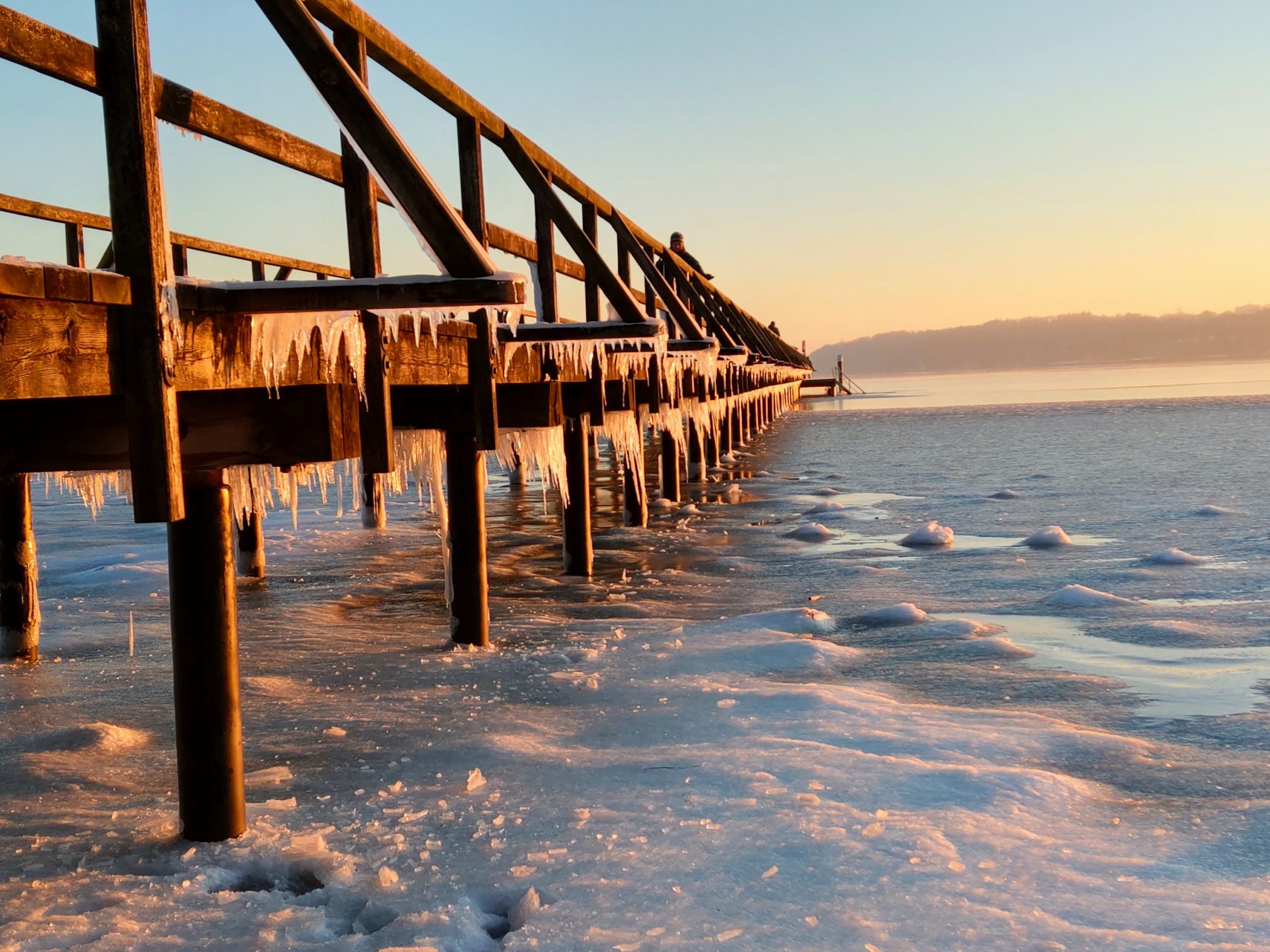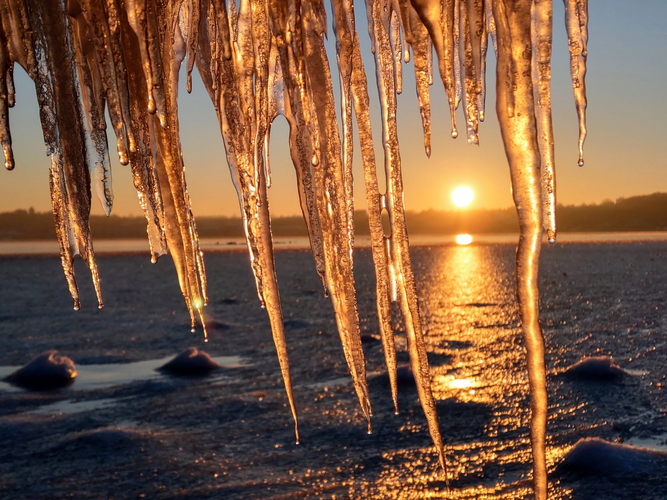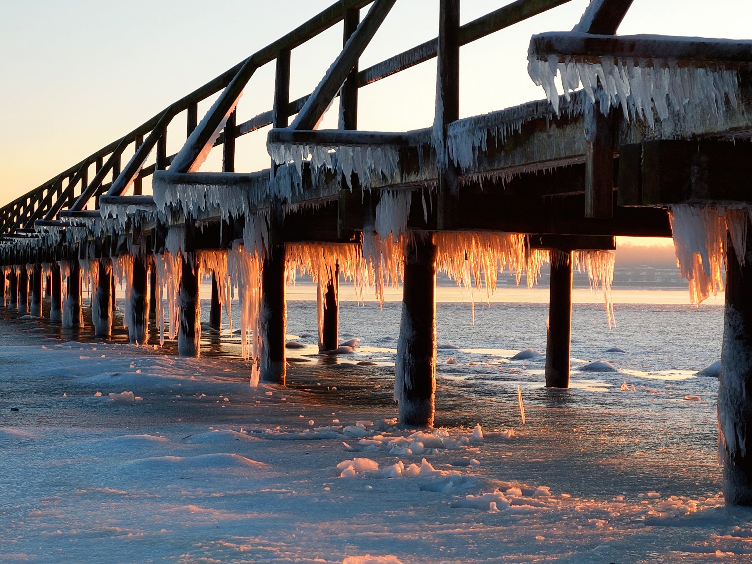 Das vor ein paar Tagen vorangegangene Hochwasser hat frostige Spuren hinterlassen. Spitze und individuell geformte Zapfen hängen unterhalb der Steganlage und verdeutlichen mir, wie kalt es wirklich ist.