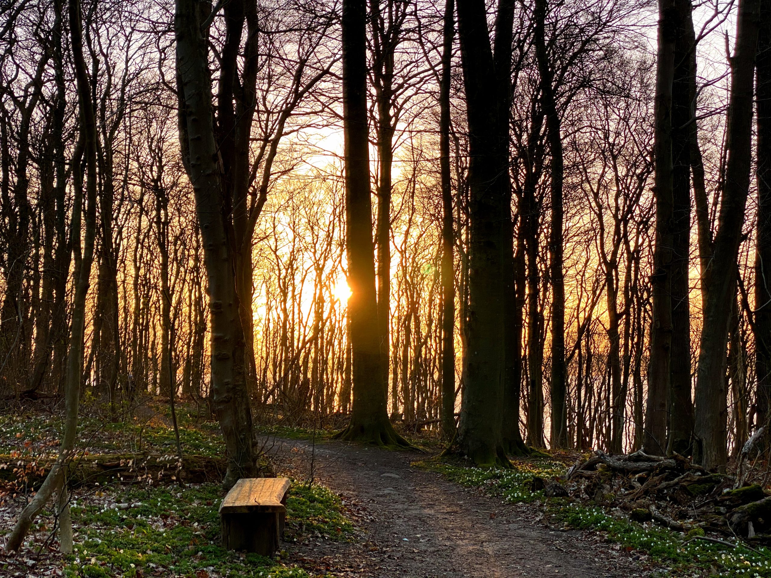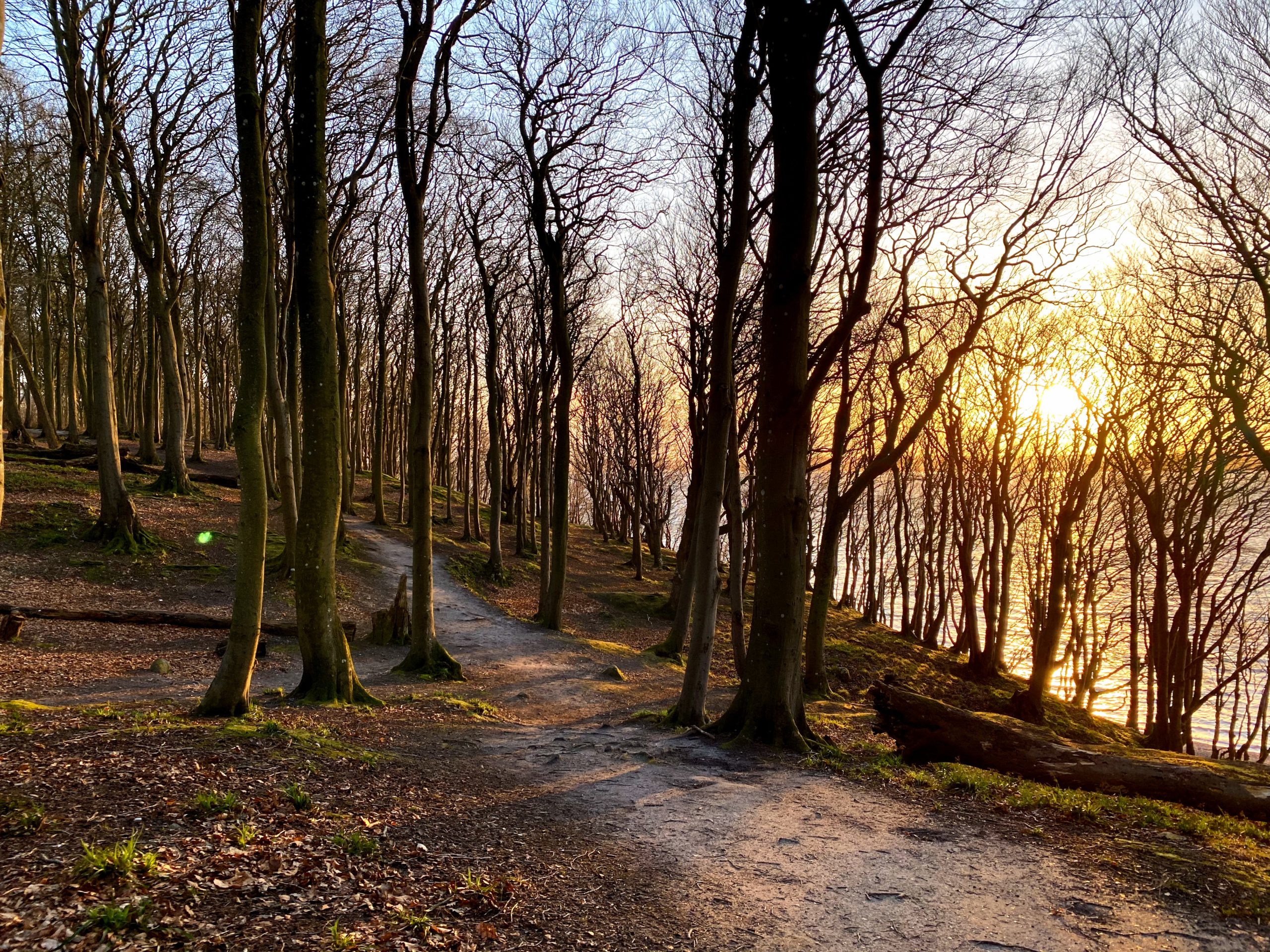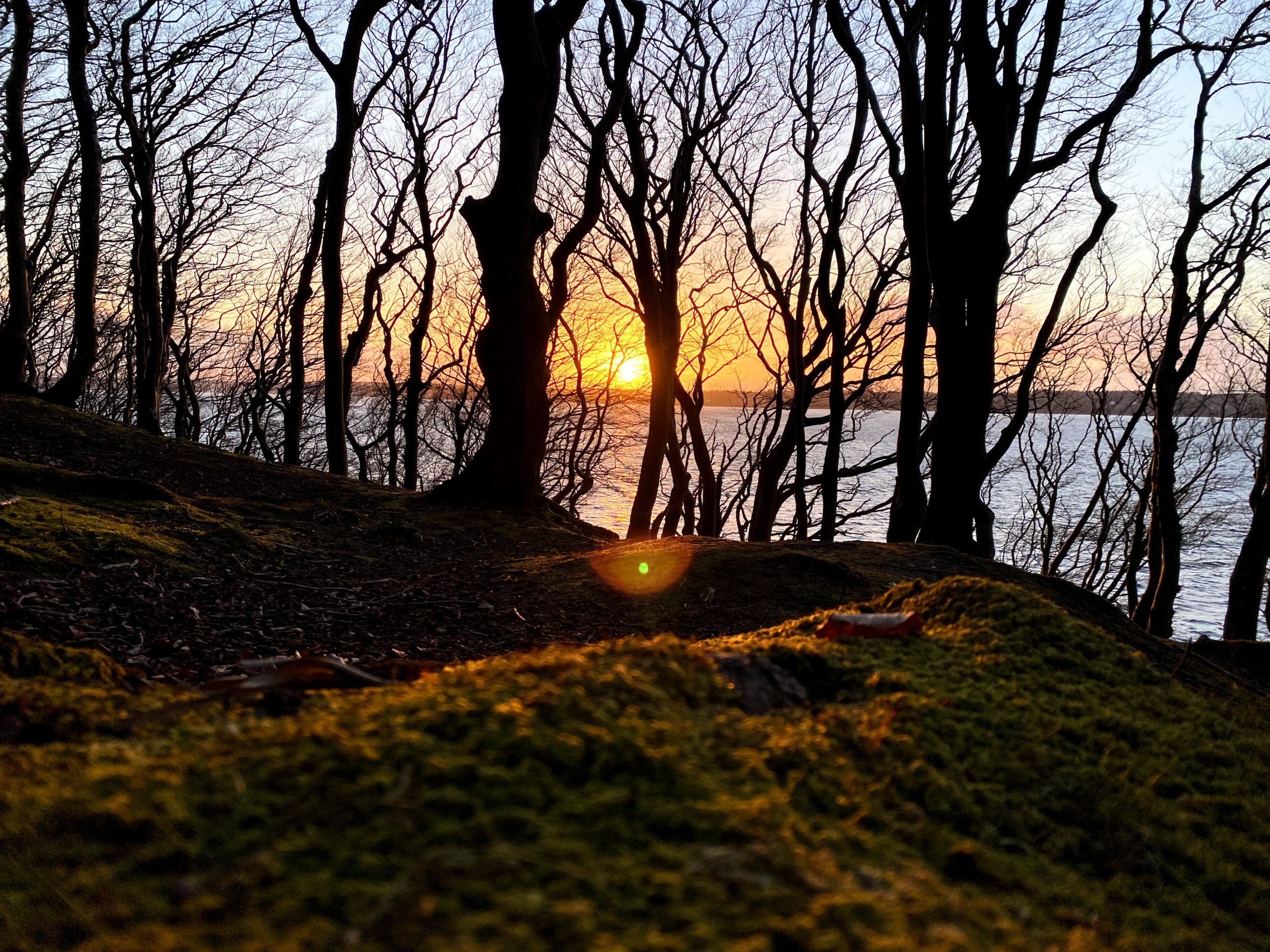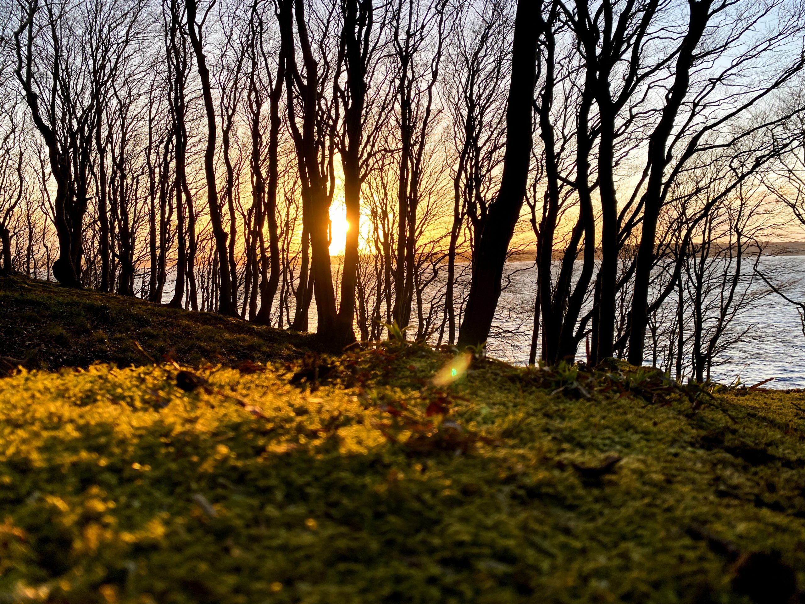 Die Sonne steht tief und überzieht das moosige Grün am Boden in ein knalliges Orange.