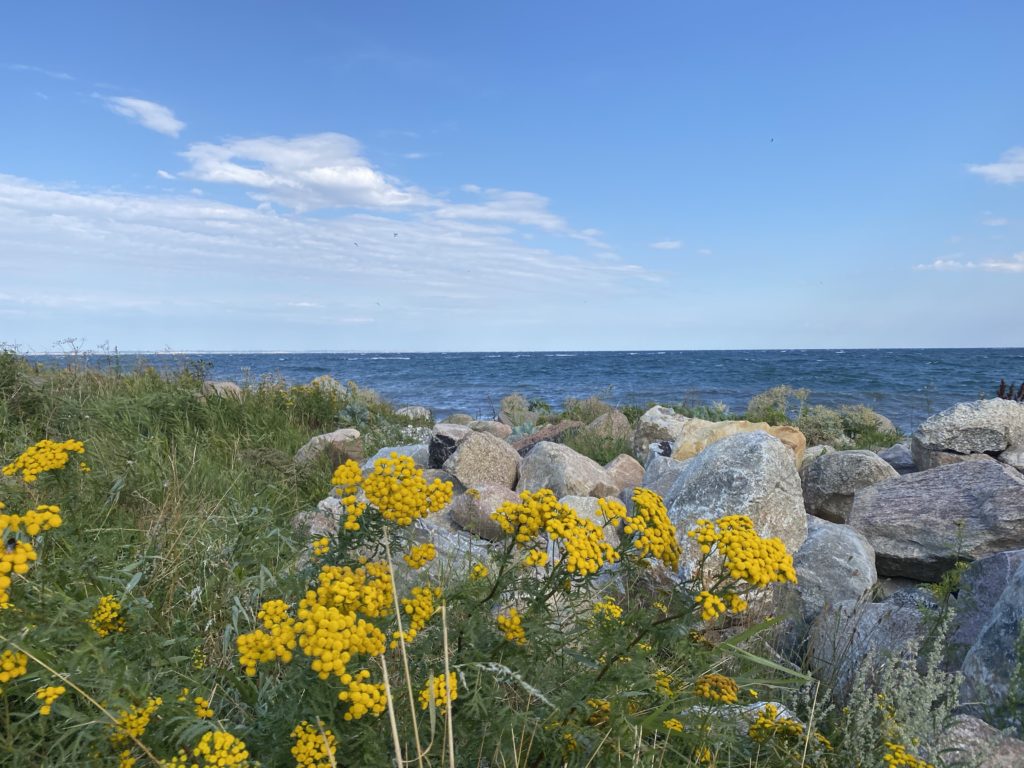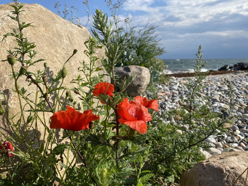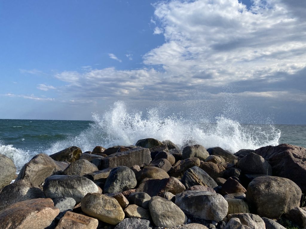 Hier an der Küste von Pøls Rev peitscht die See an der Steilküste empor und je von großen Steinen gestoppt.