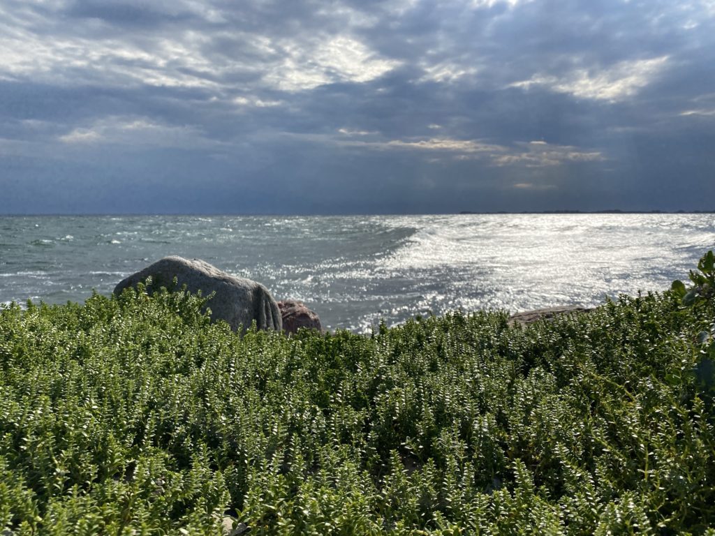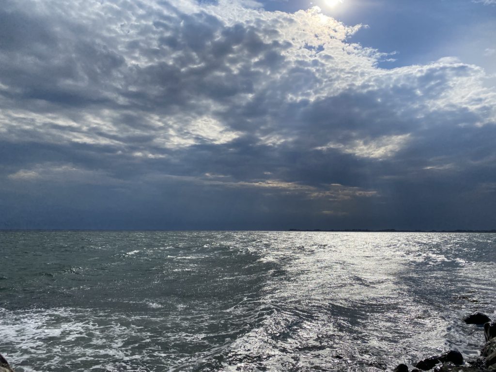 Dunkle Wolken ziehen von südosten herauf. Der Wind pfeift. Im Norden hingegen ist noch blauer Himmel. Die See schimmert in eindrucksvollen Farben.