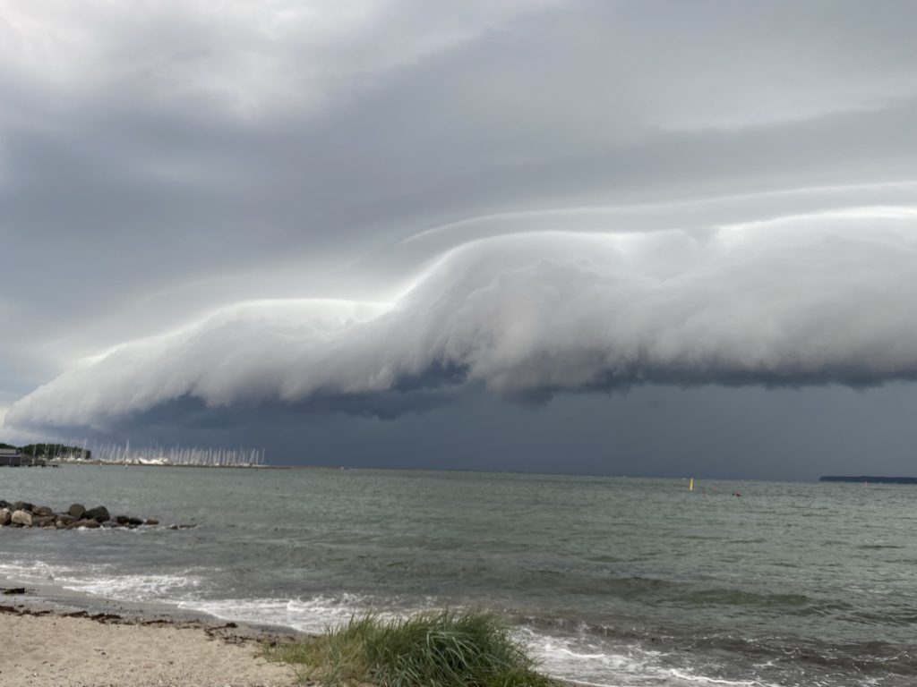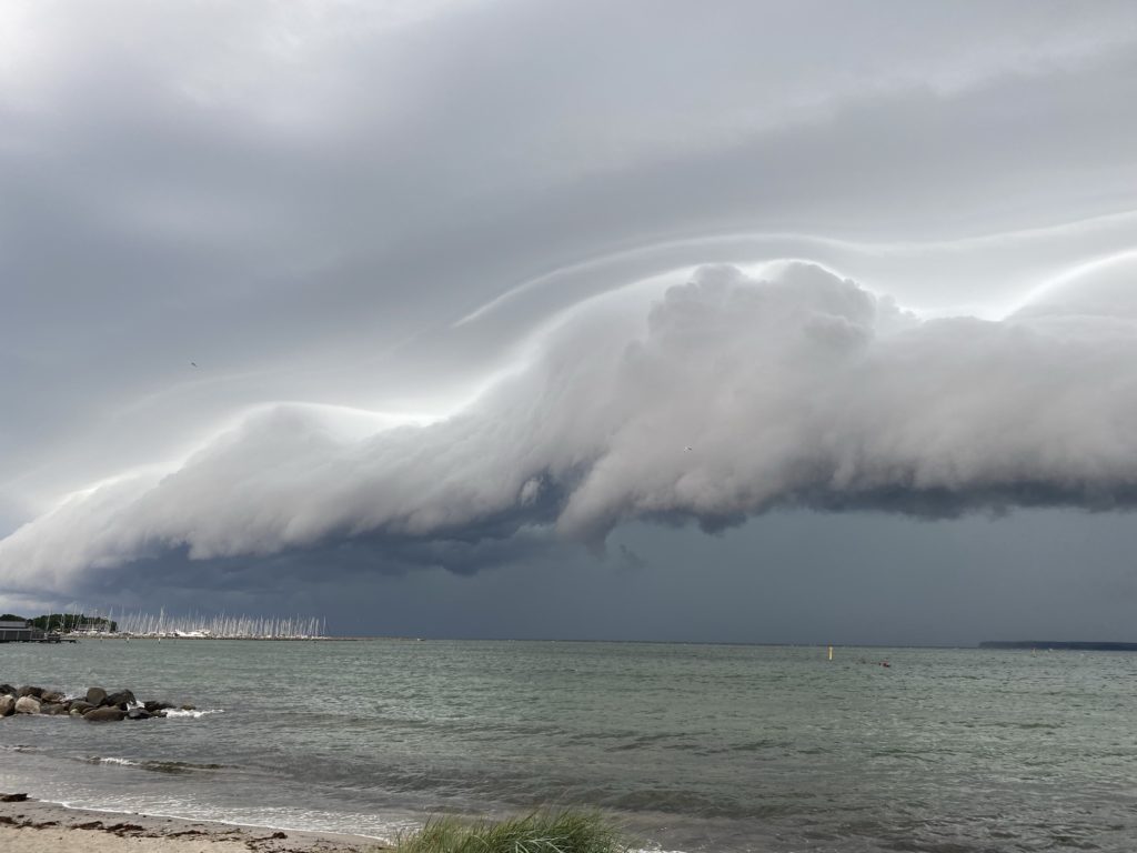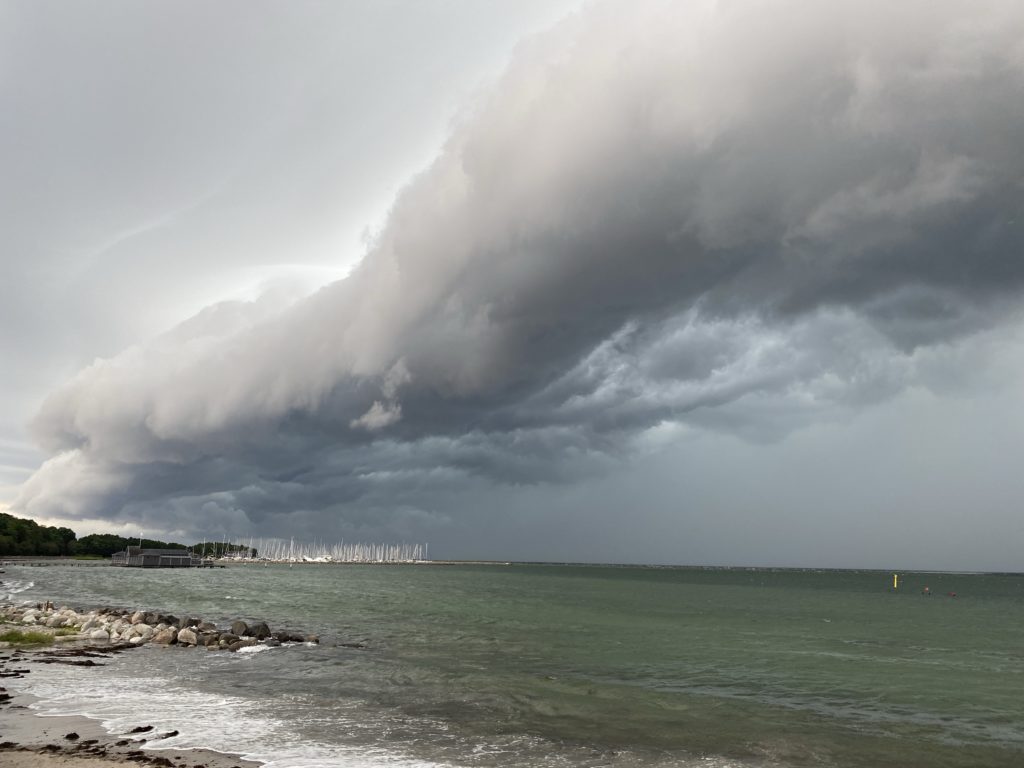 Doch plötzlich ist sue da. Die Gewitterfront, die Walze, die immer dichter kommt. In sich bewegen sich die Wolken. Der Wind pfeift. Es scheint, als würde die äußere Wolkenschicht sich schneller bewegen und irgendwie um die Innere drehen.