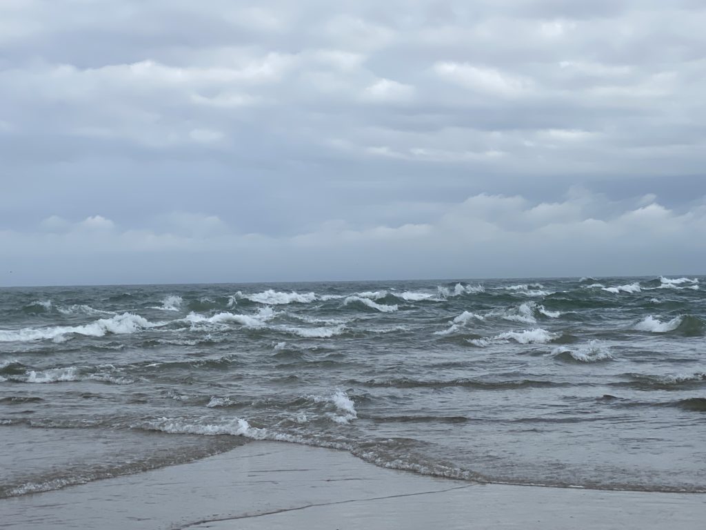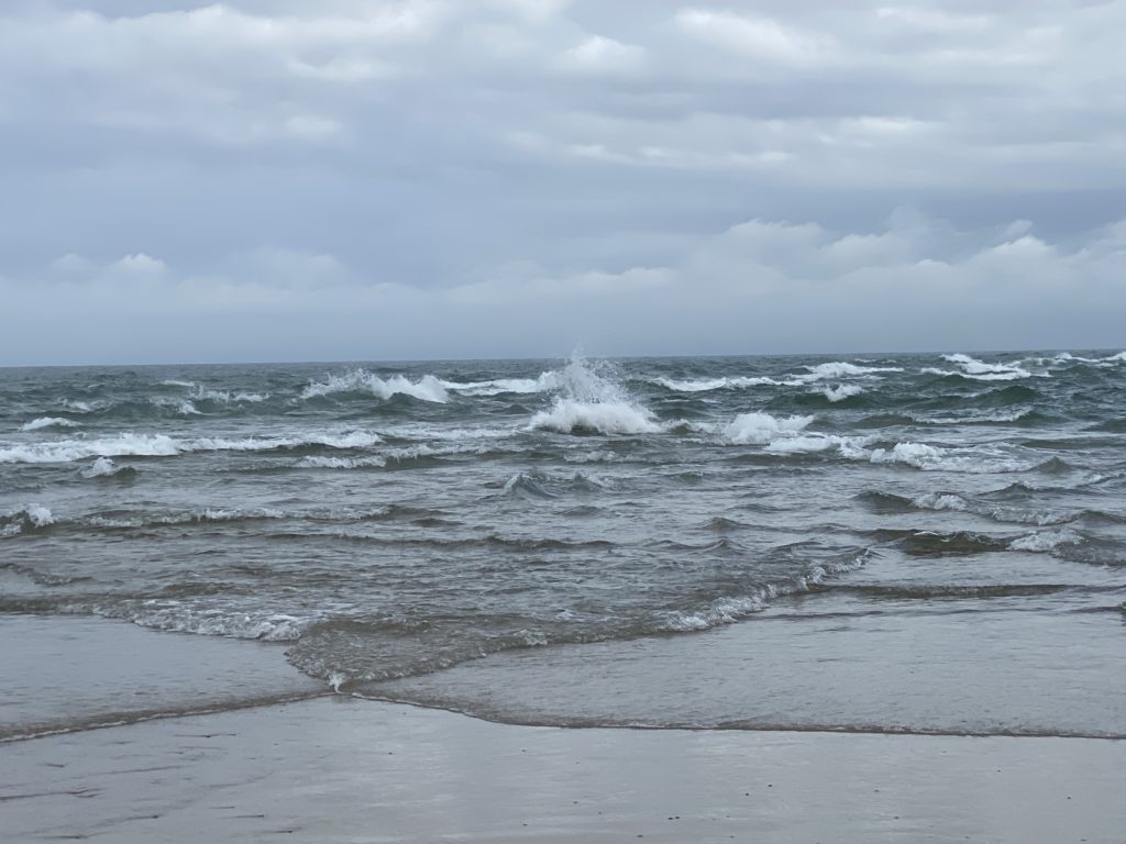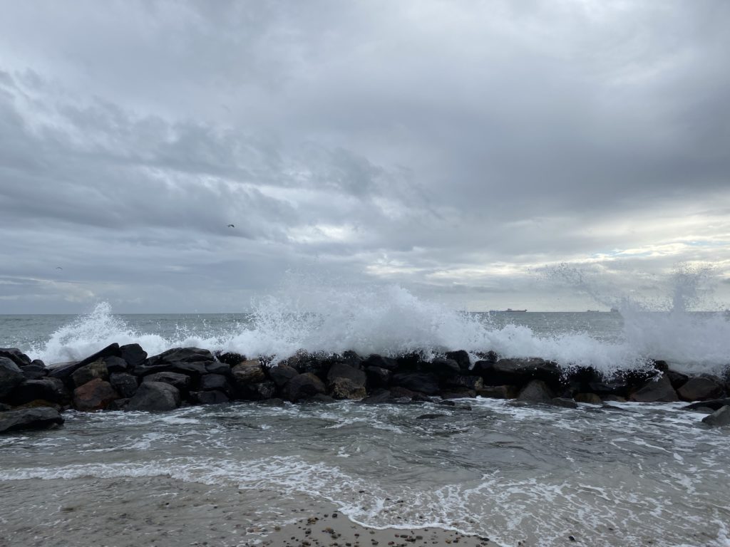 Der Sandstrand schwindet und Molen aus Stein liegen ein paar Meter vom Ufer entfernt im Wasser. Wellenbrecher. Die Küste ist hier aufgeschüttet mit Steinen. Sie werden nicht so leicht von der Brandung ins Meer gespült und verlangsamen so den permanenten Landverlust.