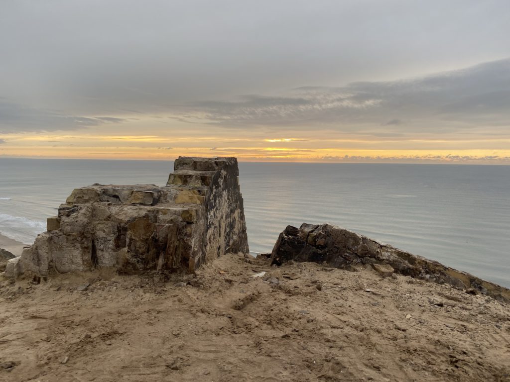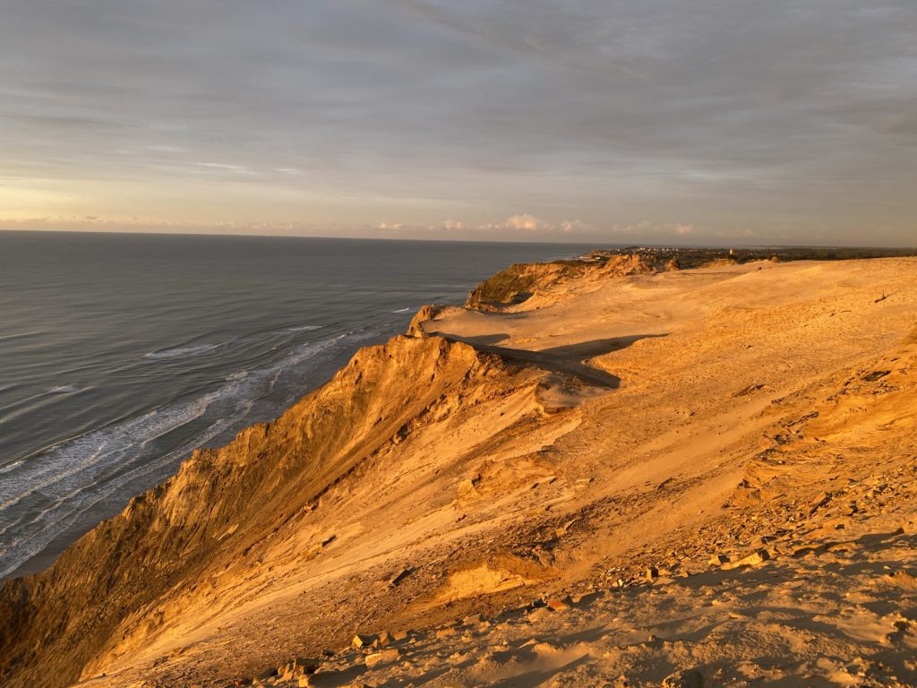 Und noch einmal zieht es mich auf die Klippen von Rubjerg Knude. Der Himmel ist. Es hat sich zugezogen. Doch weit draußen am Horizont zieht sich ein orangenes Band due Kimm entlang.