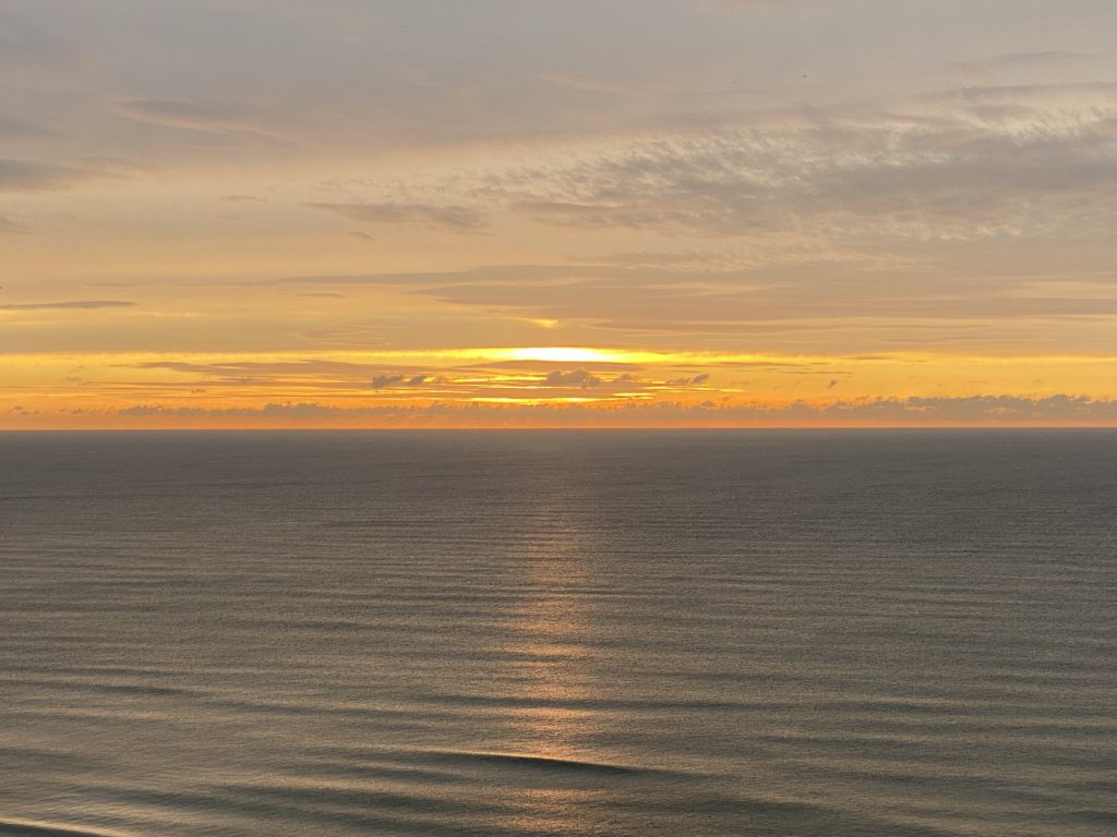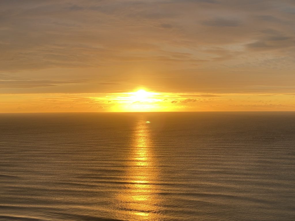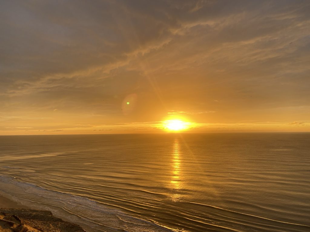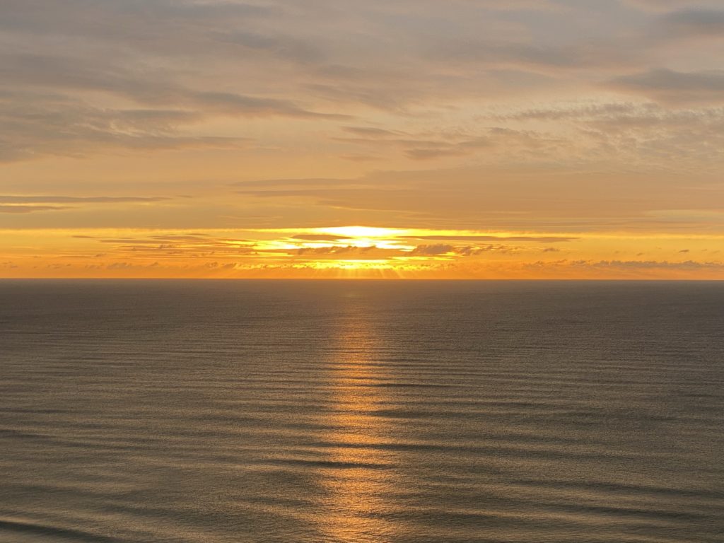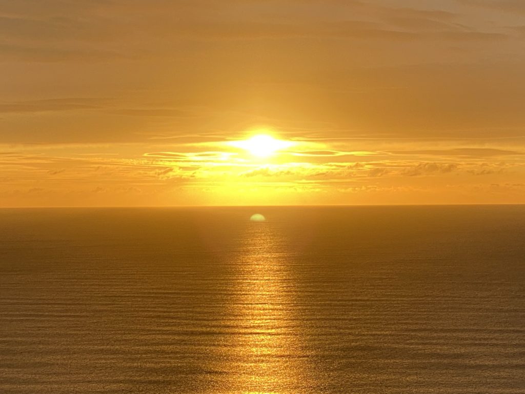 Von hier oben, 70 Meter über dem Meer, könnte ich Glück haben und den einzigen Sonnenuntergang in den paar Urlaubstagen erwischen.