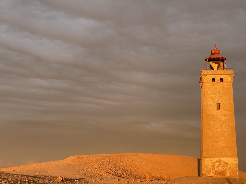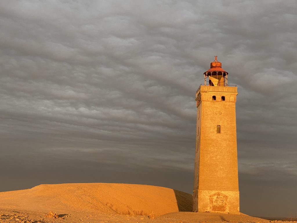 Hinter mit steht Rubjerg Knude Fyr. Der alte Leuchtturm strahlt. Er und die Sanddüne stehen genau im Licht der Sonne. Dahinter droht der Himmel in wenigen Minuten aufzureißen und alles Nass herab zu schütten.